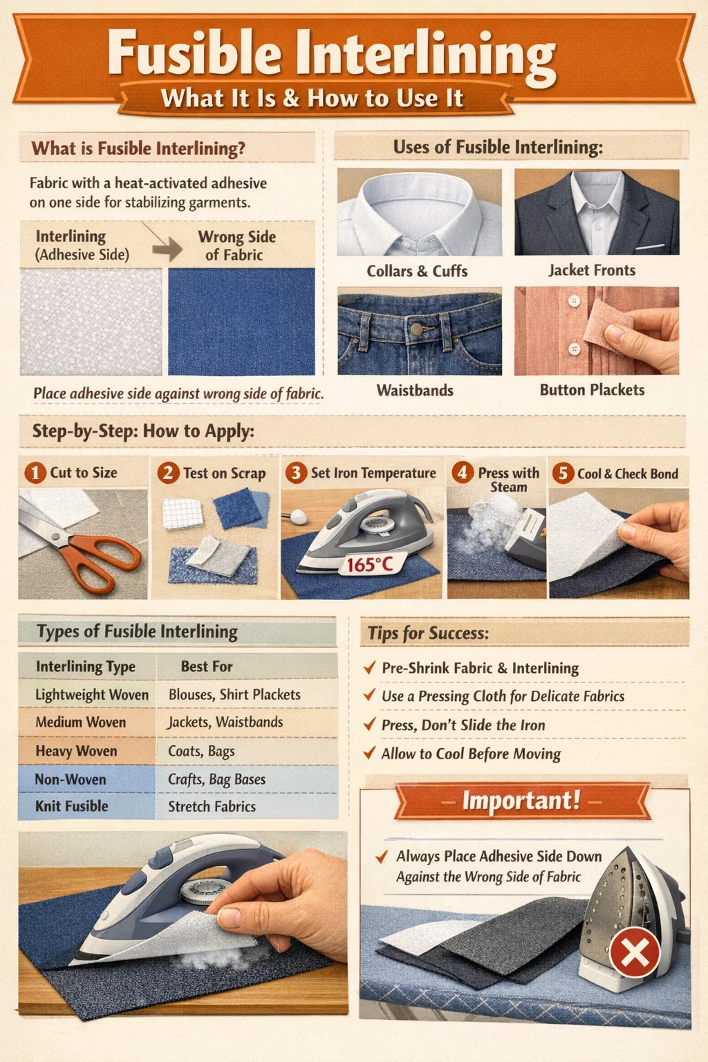| Interlinizacja Type | Najlepsze dla | Dopasowanie tkaniny | Temperatura żelaza |