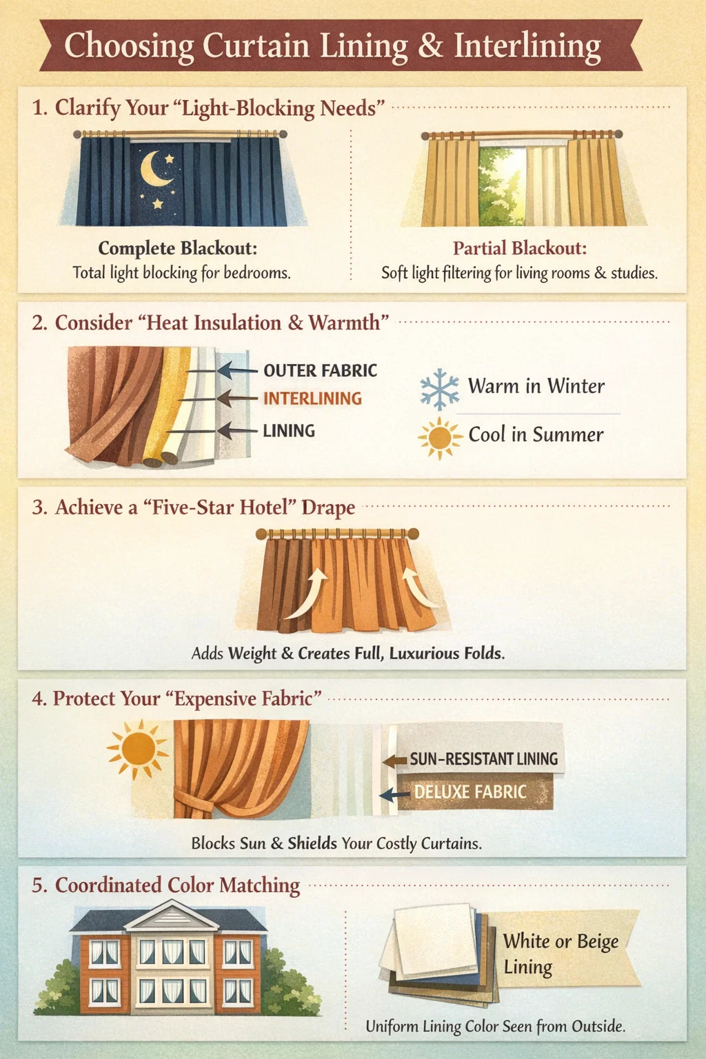 Wybór podszewki zasłonowej i interlinizacja to jak ubieranie zasłon w „bieliznę” i „odzież wierzchnią”. Zewnętrzny materiał decyduje o tym, jak pięknie wyglądają zasłony, podczas gdy te dwie wewnętrzne warstwy decydują o ich funkcjonalności i dobrym drapowaniu.