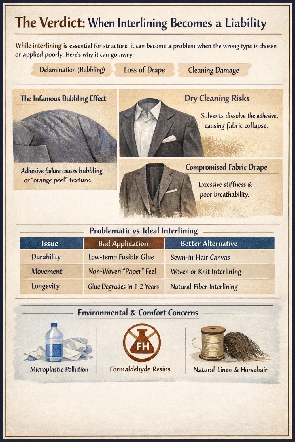 Żeby było jasne, interlinizacja nie jest z natury złe ; w rzeczywistości jest niezbędny dla struktury. Jednak staje się „złe”, gdy zostanie wybrany niewłaściwy typ lub gdy zostanie źle zastosowany. Do głównych powodów, dla których konkretna podszewka może zostać uznana za szkodliwą dla odzieży, należą: rozwarstwienie (pęcherzykowanie) , za utrata naturalnej zasłony , zand niepożądane reakcje na czyszczenie . Kiedy połączenie między wkładką a materiałem wierzchnim zawodzi, powoduje to trwałe uszkodzenia estetyczne, których nie można odwrócić.